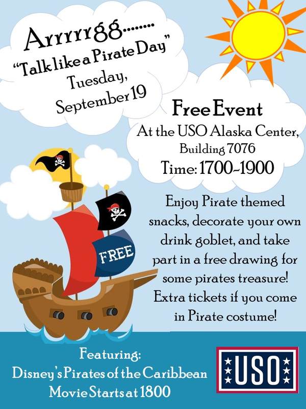 Celebrate in good true pirate fashion with pirate themed snacks, Disney’s “Pirates of the Caribbean” Movie, and a create your own treasured drinking goblet.Tuesday, September 19, at 1700-1900 at the USO Alaska Center, Building 7076. Arrrg… we hope to see ye matey there!