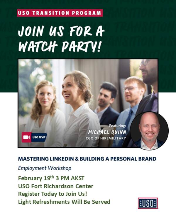 Join us for a watch party where the USO will live-stream the “Mastering LinkedIn” 2-hour workshop facilitated by Michael Quinn. This workshop is designed to equip you with the tools you need to navigate LinkedIn, leverage networking opportunities, access critical resources, and understand the hiring process.